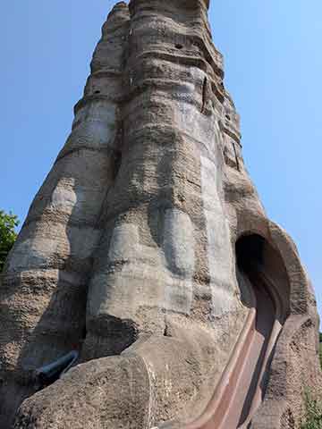 水遊びエリアのすぐ横には溶岩すべり台があり、6歳の長男はここに夢中でした。何度も階段を上り、勢いよく滑り降りる姿は見ている側が少し不安になるほどでした。ですが、すべり台の近くには安全のためにヘルメットが用意されており、着用して遊べる点は安心材料でした。